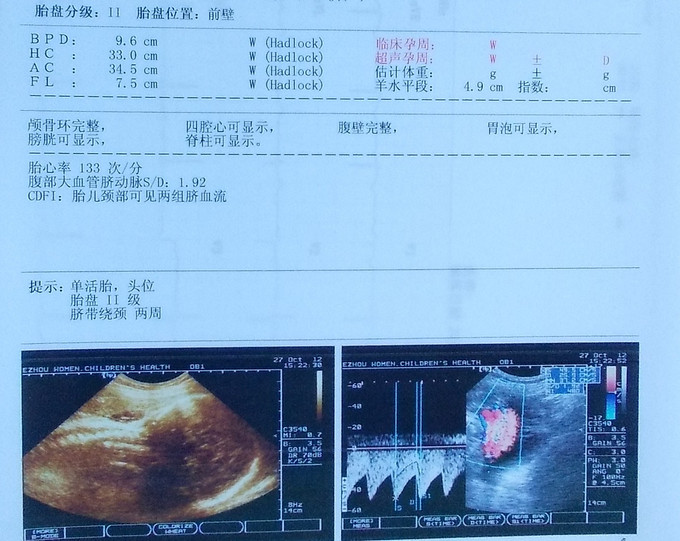 T:36.7℃,HR 82次/分,R 20次/分,BP 106/60mmHg,心肺无明显异常。 产检:腹围97cm,宫高34cm,头位,胎心率140bpm。 B超:头位,BPD 9.6cm,胎盘II级。单活胎 脐带绕颈两周 血常规,肝肾功能,凝血功能无明显异常,乙肝丙肝梅毒艾滋均阴性。