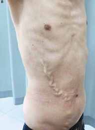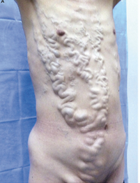 主诉:间歇性腿部水肿5年 病史:中年男性,间歇性腿部水肿5年,由于右腹壁和胸壁静脉曲张被送进医院,静脉曲张的大小和数量逐渐增加,历时18年。(如图)