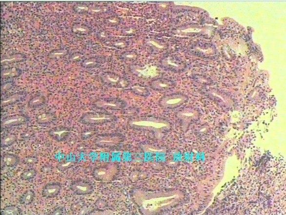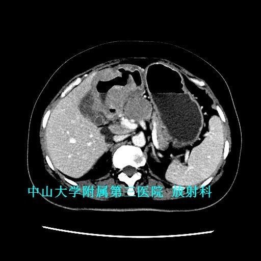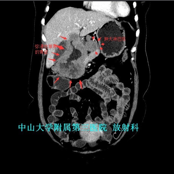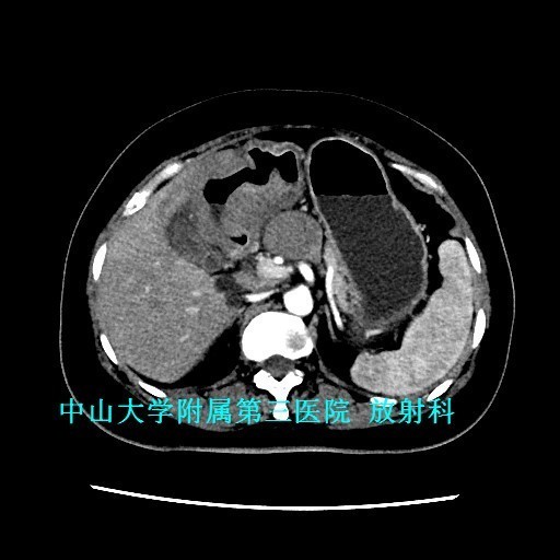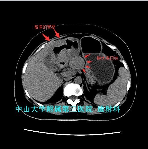 讨论:原发性胃肠道淋巴瘤是一组起源于胃肠道黏膜下层淋巴组织的恶性肿瘤,成人较少见,约占胃肠道恶性肿瘤的1~4% 。影像表现具有一定特征性:弥漫性或局限性胃壁增厚是胃淋巴瘤主要特征,增厚的胃壁内缘呈波浪样或分叶状,外缘较光整,胃腔有一定的扩张度,增强扫描动脉期呈轻中度强化,静脉期持续强化。主要与胃癌鉴别,胃癌也表现为胃壁增厚,但一般增厚无淋巴瘤明显,而且胃壁僵硬,官腔变窄,常有浸润周围组织器官。 参考文献:侯明杰,齐鹏飞,高万勤等.原发胃肠道淋巴瘤的影像表现和误诊分析[J].实用放射学杂志,2014,(12):2112-2113,2121.