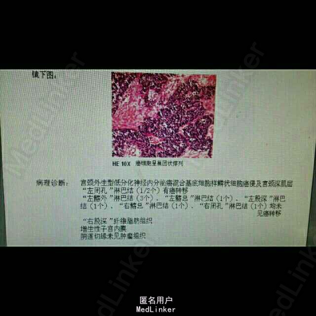 完善相关检查后,全麻下行宫颈癌根治术,术后常规抗炎对症治疗。术后病理提示宫颈外生型低分化神经内分泌癌伴混合基底细胞癌。术后行力扑素240mg+卡铂400mg化疗。