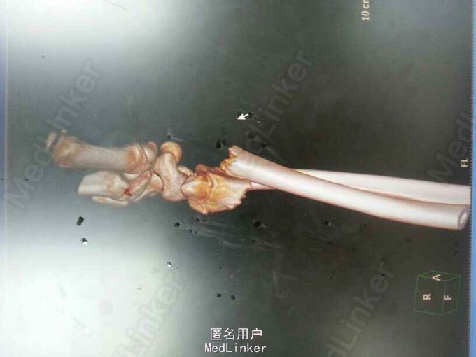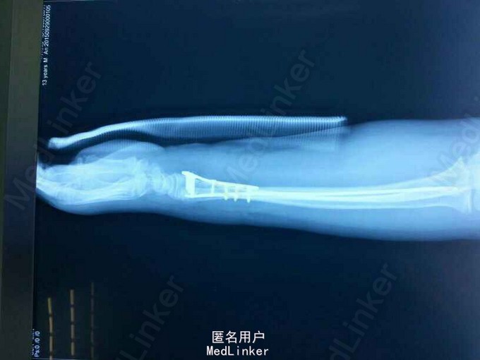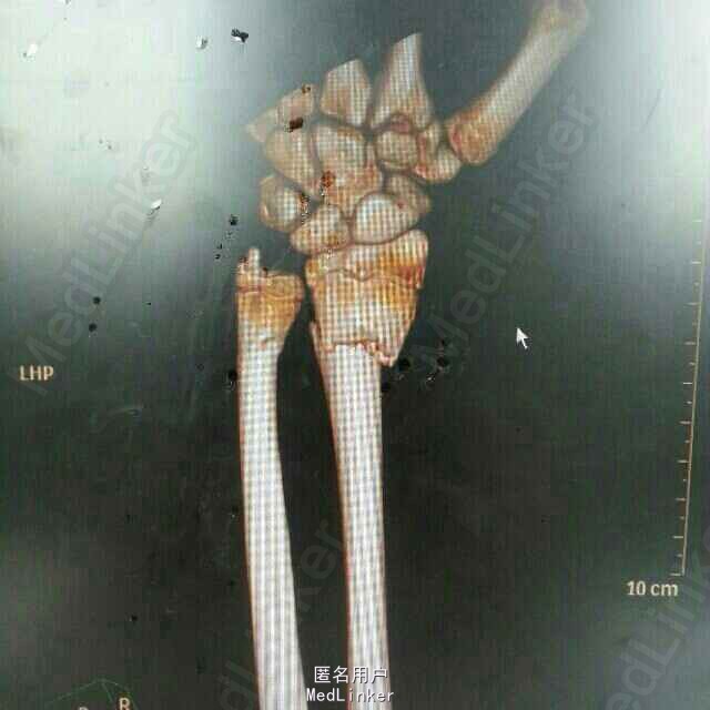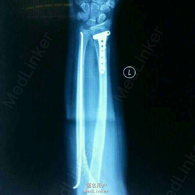 诊断:左桡尺骨远端骨折。治疗:伤后3天在全麻下行左桡尺骨骨折切口复位钢板弹性钉内固定术