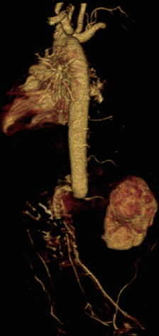 入院诊断:新生儿缺氧缺血性脑病、胎粪吸入性肺炎、新生儿低血糖症、巨大儿。患儿入院后予苯巴比妥止惊、抗感染、营养心肌、营养神经等对症支持治疗。入院第3天患儿抽搐止,双上肢肢端肤色红润、皮温正常、CRT正常,双下肢肢端肤色苍白、皮温低、CRT 延长,双上肢血压高于双下肢,血压差异超过 20 mmHg。予行心脏彩超查:左、右室心肌肥厚, 左室流出道梗阻, 卵圆孔未闭。 腹主动脉超声检查:腹主动脉近肾动脉水平内可见实质性低回声充填,内未见明显血流信号,双侧髂外动脉血流速度约15cm/s, 呈阻塞性频谱。进一步头颅及腹部增强 CT 示: 头颅未见明显异常;左肾动脉平面以下腹主动脉、髂总动脉未见显影,考虑为动脉栓塞可能;主动脉弓远端轻度缩窄;主动脉弓远端囊样突出,不除外弓动脉残留并附壁血栓形成;室间隔及左右室壁心肌肥厚;左肾血灌注减低,不除外左肾动脉受累狭窄。
