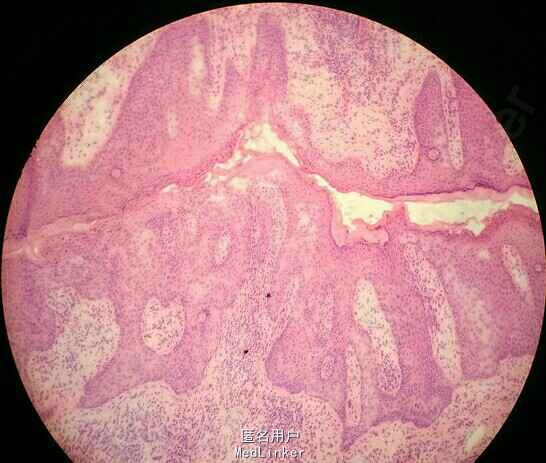 查体见乳头乳晕区粗糙,脱屑,皮肤糜烂出血,双侧乳腺未及明显肿块,无乳头溢液。行乳腺及腋窝淋巴结B超检查,未见异常。于局部红斑处行皮肤活检,病理示乳腺Paget病。