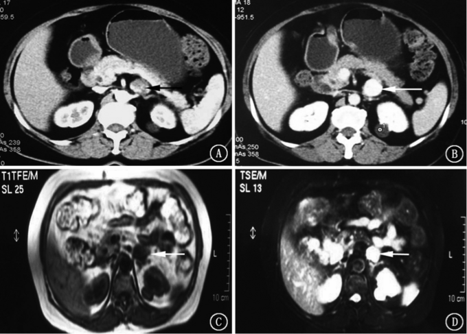 患者,女,62 岁。 因“阵发性血压升高10 年,加重6 个月,发现左肾上腺占位2 个月”入院。 患者10 年前无明显诱因开始出现发作性血压升高,发作时伴全身震颤、心悸、大汗,多于凌晨4 ~5 点发作, 血压最高达175/55 mmHg,先后服用硝苯地平、厄贝沙坦片等,血压可以控制在150/60 mmHg 左右。6 个月前症状加重,发作频率增加。患者因胃痛于当地 医院就诊,B 超检查示左侧肾上腺区低回声占位。腹部增强CT 检查:左侧肾上腺前方不规则肿块,大小约4.5 cm×2.5 cm×3.9 cm,与左侧肾上腺体部分界不清,增强扫描动脉期边缘强化,门脉期造影剂向内充填,延迟期为均匀高密度,腹膜后占位考虑良性病变可能。腹部MR 检查:腹主动脉左前方肿块,边缘清晰光滑,T1WI 呈低信号,T2WI 呈明显高信号,腹膜后占位性病变考虑为嗜铬细胞瘤可能(图1)。
