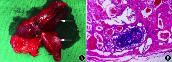 诊断:左侧嗜铬细胞瘤。 治疗:服用酚苄明5 mg,2 次/d,血压控制在130/60 mmHg。在全麻下行腹腔镜下左侧肾上腺肿瘤切除术,术后未服用任何降压药物,血压维持在120~138/50~72 mmHg。病理检查:肿瘤剖面可见血窦和血管,光镜下可见密集的毛细血管,排列紊乱,部分血管扩张充血呈海绵状,诊断为海绵状血管瘤(图2)。