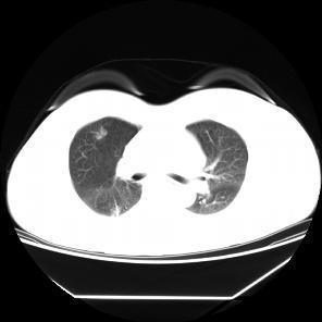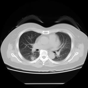患者,女,57岁,因“右肺占位”于2015-09-17 15:08入院。 患者缘2月前体检无意发现右肺占位,伴随症状:无咳嗽、咳痰、无胸闷、胸痛、气短,无头晕、视物旋转,无恶心、呕吐,无腹痛、腹泻,无尿急、尿频、尿痛,2015-7-1 CT示:1.右肺上叶前段及下叶背段结节伴实变,右肺下叶结节见支气管气相征,考虑炎性病变可能,建议治疗后复查除外肿瘤性病变;双肺多发炎症;2.双侧胸膜肥厚;肺动脉增宽,提示肺动脉高压;3.肝左外叶小囊肿;4.甲状腺双叶增大,考虑为甲状腺肿,请结合临床。2015-9-2复查CT示:1.右肺上叶前段结节较前片无明显变化;右肺下叶背段结节较前片增大,建议进一步检查除外肿瘤性病变;双肺多发炎症较前片吸收;2.双侧胸膜肥厚;肺动脉增宽;3.肝左外叶小囊肿;4.甲状腺肿大,同前片。以“右肺占位”收住院,自发病以来,食欲减低,体重无明显下降,大小便无异常。