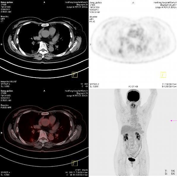 入院查体:体温:36.6℃,脉搏:85次/分,呼吸:18次/分,血压:135/90mmHg。[专科检查]胸廓未见异常,胸骨无压痛,乳房正常对称。呼吸运动未见异常,肋间隙未见异常,语颤未见异常。叩诊清音,呼吸规整,双肺呼吸音清晰,双侧肺未闻及干、湿性罗音,无胸膜摩擦音。心前区无隆起,心尖搏动未见异常,心浊音界未见异常,心率85次/分,律齐,各瓣膜听诊区未闻及病理性杂音,无心包摩擦音。 辅助检查:红细胞沉降率测定(ESR)22mm/1h;癌胚抗原(CEA)0.65ng/ml;血常规及凝血四项无明显异常。