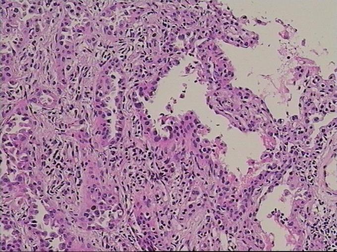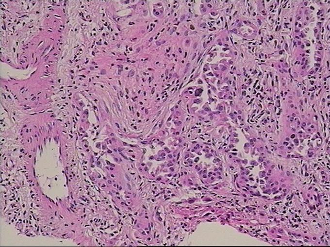 患者无任何症状,体检发现肺部小结节影,观察2月,未见缩小,似有轻度增大,入院后经CT引导下肺穿刺活检提示高分化腺癌,行手术治疗。 周围型肺癌早期影像学表现为孤立的肺内结节或肿块,通常有分叶征,毛刺征,空泡征,支气管充气征,坏死液化或空洞形成。此患者仅表现为淡薄的渗出影,小结节影,观察2月没有变化后,经穿刺证实肺癌,因此对肺部小结节影,斑片影,不吸收,无钙化的要特别注意肿瘤可能。