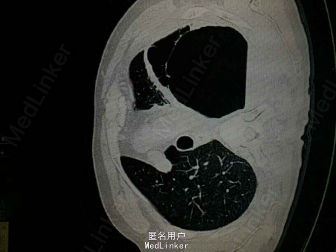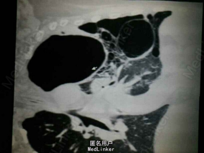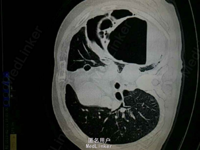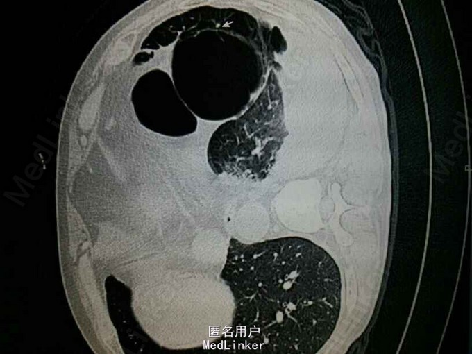 查体:左肺叩诊鼓音,左肺呼吸音低,左下肺可问及少量湿啰音。 辅助检查: CT提示:左肺多发大小不等的囊状气腔,部分病灶壁较厚,可见液平。左肺可见斑片状渗出。左侧胸腔积液。考虑左肺多发肺大泡伴感染,左侧胸腔积液。双肺气肿。