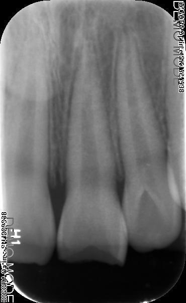 检查:#21 牙冠折断约2mm,叩(+-),松(I°),见露髓孔,冷热侧一过性敏感,电测无活力,牙龈稍红肿