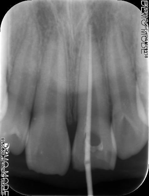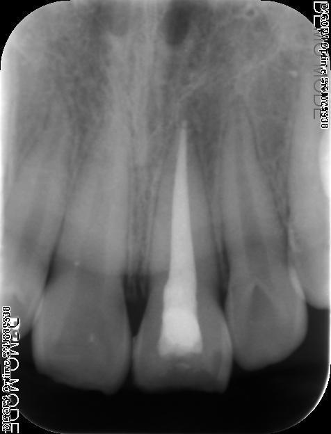 诊断:#21冠折 治疗:#27碧兰麻下开髓,清理髓腔及根管,双氧水和生理盐水交替冲洗,测WL,拍片试尖达工作长度,根管内导入糊剂,侧压充填中下段,热牙胶充填上段,X线示恰填,树脂充填修复。