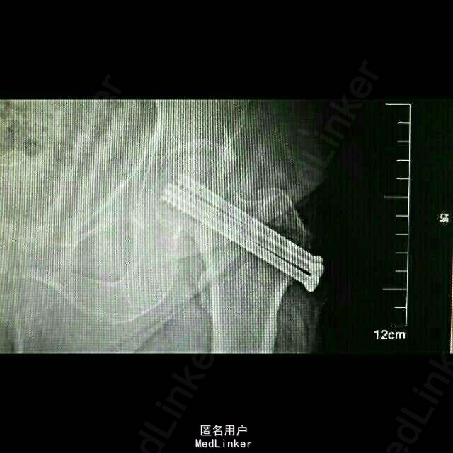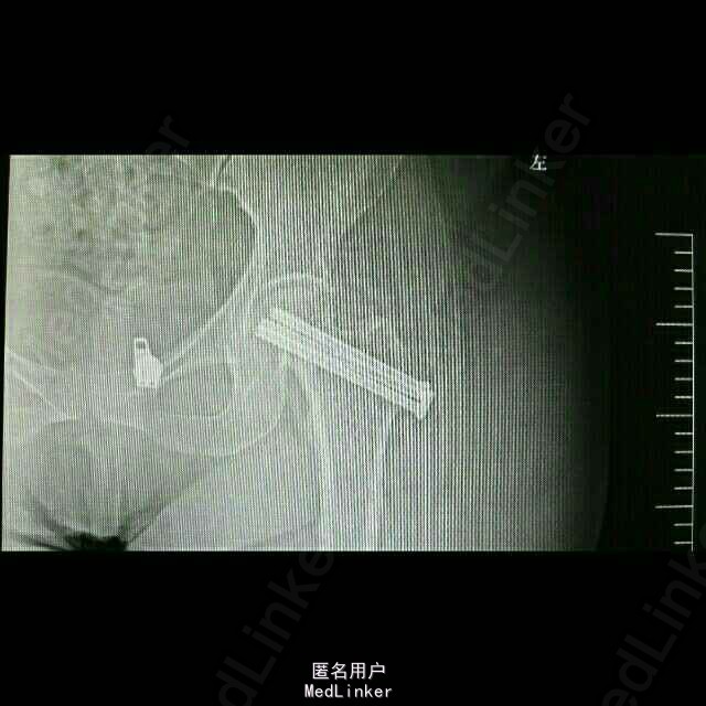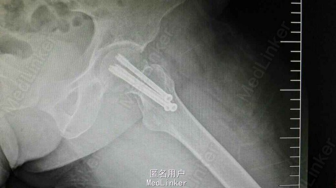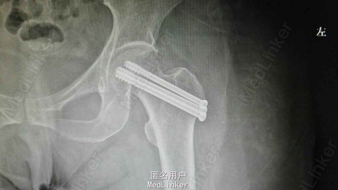 诊断:左股骨颈骨折(头下型,Garden IV期) 治疗:闭合牵引复位开心钉内固定术