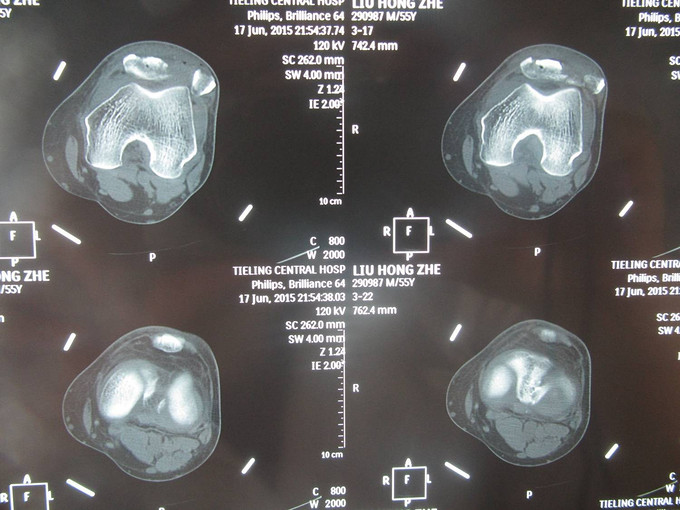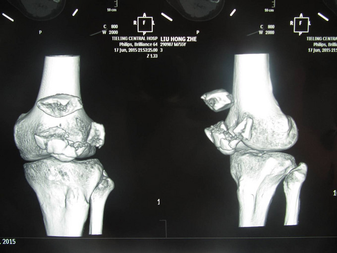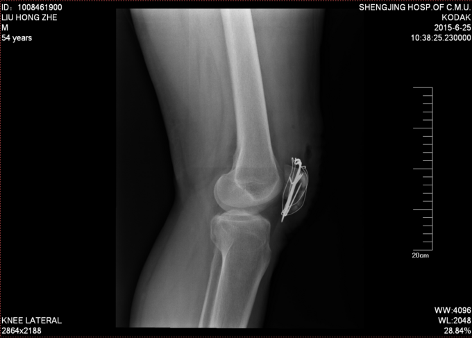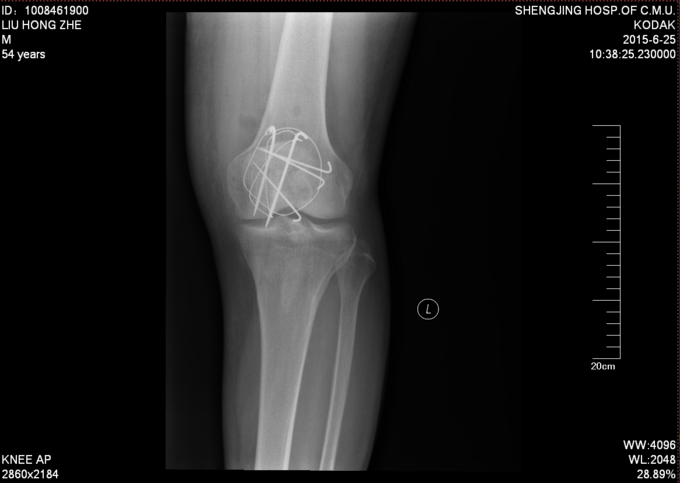 患者自诉于2015年5月17日晚21点多在外不慎摔伤,致左膝部疼痛肿胀活动受限,当时无意识不清,急诊送当地医院(铁岭市中心医院),行左膝关节DR及三维CT:左髌骨骨折。今为进一步治疗急于我院中国医科大学附属盛京医院,行X线片检查示:左髌骨骨折,急诊以“左髌骨骨折”为诊断收住入院。