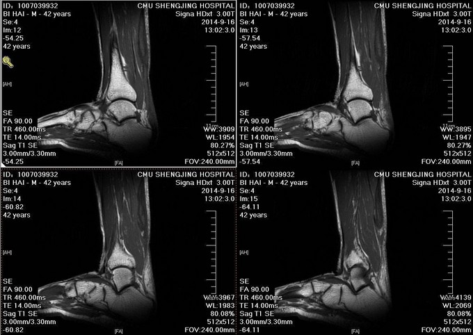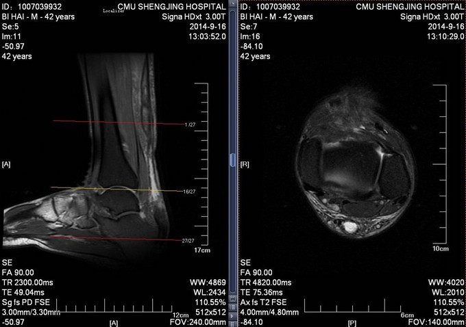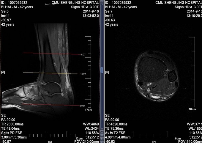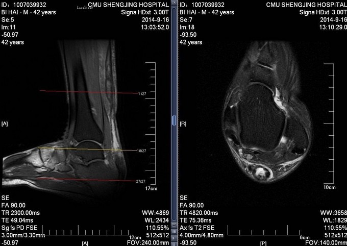 患者于2014年7月28日打排球时不慎摔伤,自觉左足跟部一过性剧烈疼痛,意识清醒。自觉足跟部及小腿后侧远端疼痛、行走时左足无力。于2014年9月10日就诊于当地医院,行相关查体后提示:左脚跟腱断裂。患者为进一步治疗门诊以“左跟腱断裂”为诊断收入病房