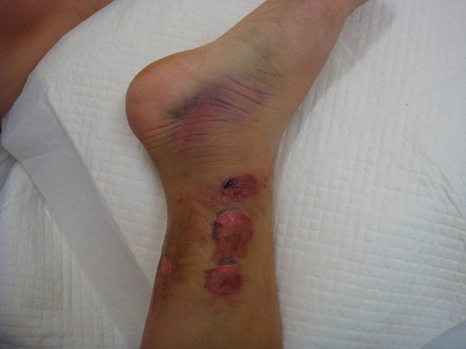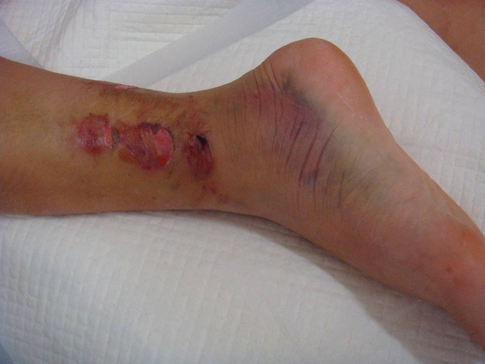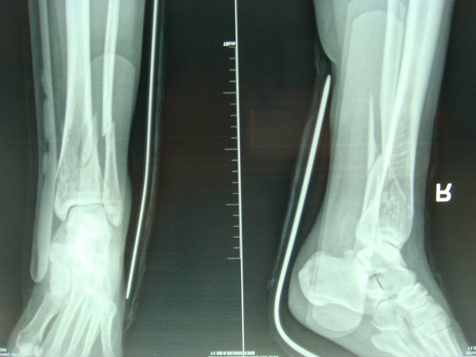 主诉:右小腿外伤后6天 现病史:患者2014-10-19日晚9时左右下楼时不慎摔倒,后于骨科医院就诊,行右下肢DR检查,提示右胫腓骨远端粉碎性骨折,后患者于骨科医院行夹板固定,并与当地祝家镇诊所输液治疗,具体治疗方案不详。后患者为求进一步诊治逐来我院。并以右胫腓骨远端粉碎性骨折收入院。患者病来一般状态可,二便正常,饮食睡眠可。