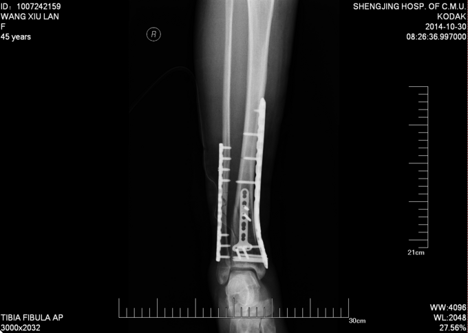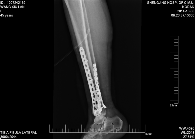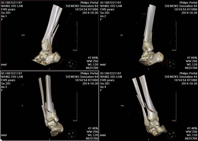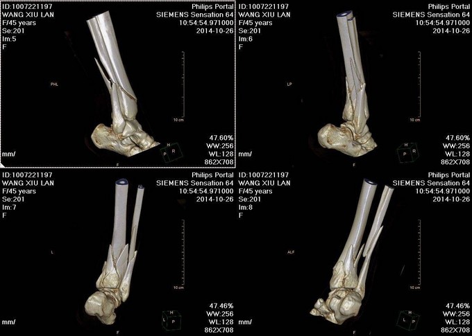 诊断:右胫腓骨远端粉碎性骨折 患者为右plion骨折,入院后局部肿胀明显,给予患肢抬高,冷敷,消肿等对症治疗,密切观察患肢皮肤情况,带皮肤条件良好的情况下,约2周后行右三踝骨折切开复位钢板内固定术。