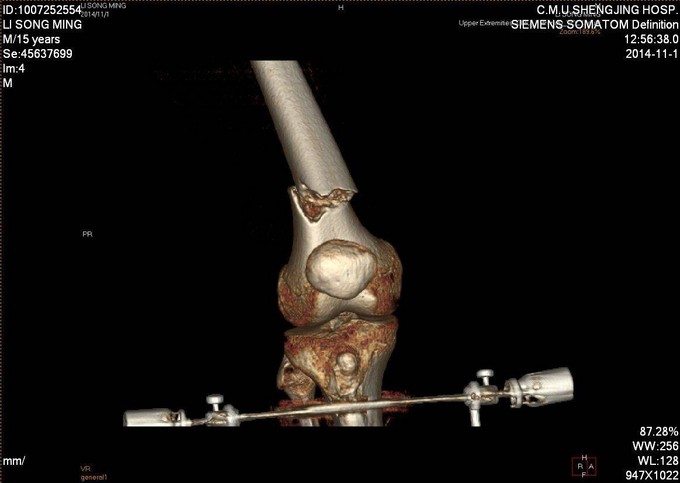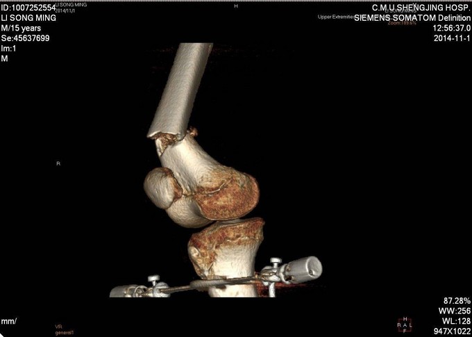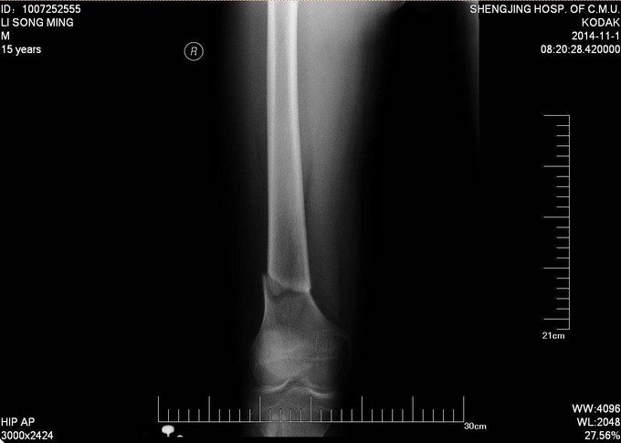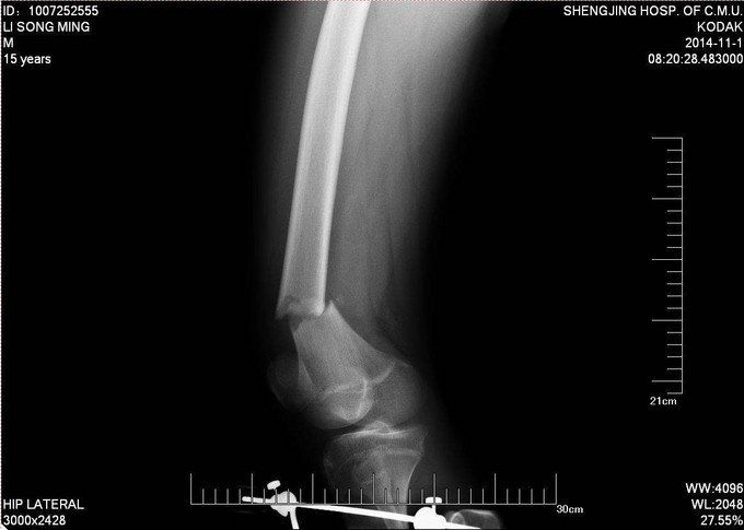 患者及家属自述于2014年10月31日,在学校与同学打闹过程中不慎别伤,伤后自觉右大腿疼痛伴有活动受限,就诊于当地医院行股骨正侧位X线片提示:右股骨远端骨折。未于治疗。后患者为求进一步诊治来我院急诊就诊,请我科会诊后,诊断为右股骨远端骨折,建议手术治疗,收入病房。伤来饮食、睡眠欠佳。大小便正常,体重无明显变化。