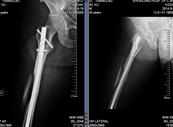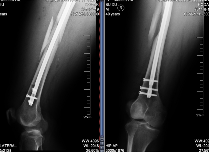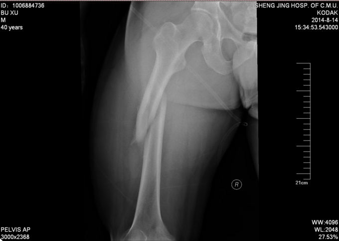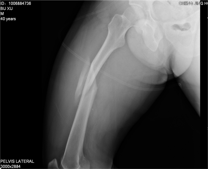 诊断:右股骨干骨折 患者入院后急诊行右胫骨结节骨骼牵引术,术后维持患者长度,减轻患者疼痛,完善相关检查后,行右股骨干骨折闭合复位髓内针内固定术。