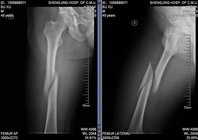 患者于2014-8-14 13:30左右,工作时不慎被重物砸伤,当时无法站立,自觉头晕,意识清楚,自觉大腿部疼痛,无法活动,被急送往我院急诊,经检查诊断为“右股骨干骨折”,给予对症处置,并请我科会诊,现患者为进一步诊治,转入我科病房,我科以“右股骨干骨折”为诊断收入院,患者伤后无昏迷,无恶心呕吐,无呼吸困难,至今未排便排气