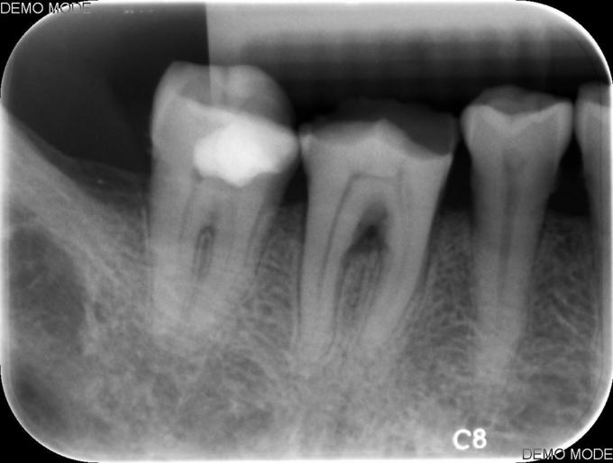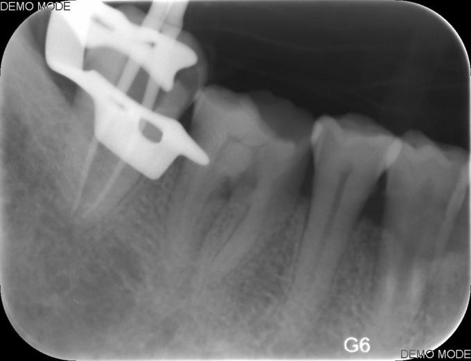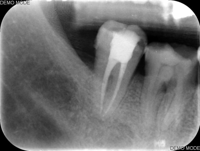 诊断:牙髓坏死 治疗#47碧兰麻下开髓,封三甲+OC球,ZOE暂封,嘱2周后复诊,不适随诊。 去暂封,清理髓腔及根管,双氧水和生理盐水交替冲洗,测WL,拍片试尖达工作长度,根管内导入糊剂,侧压充填中下段,热牙胶充填上段,X线示恰填,树脂充填修复。
