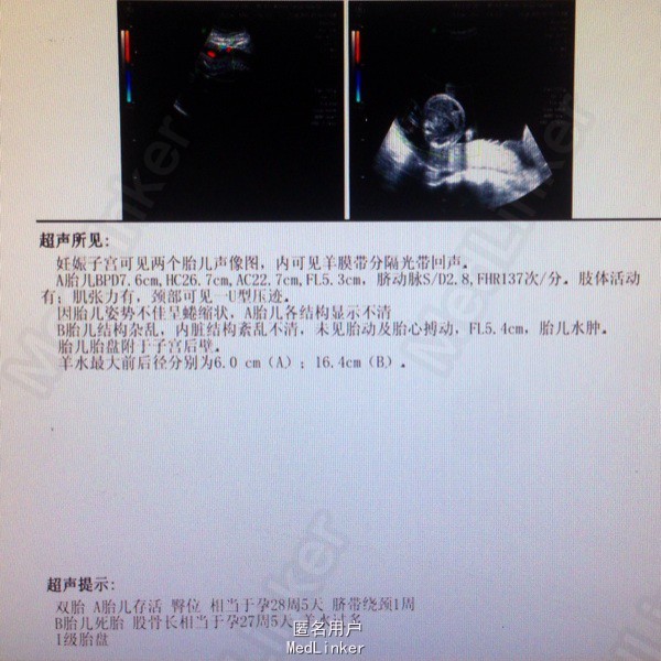 主诉:孕28周3天,彩超示双胎输血综合征 现病史:26岁女性患者,平素月经规律,现孕28周3天,昨日外院查B超提示双活胎,羊水量极多,B胎儿全身皮肤及内脏、脐带水肿,S/D比值偏高,考虑双胎输血综合征可能,今来我院复查B超提示,A胎儿存活,B胎儿停滞发育,A胎儿相当于28周2天,B胎儿相当于29周2天,I级胎盘,羊水多,收入院。