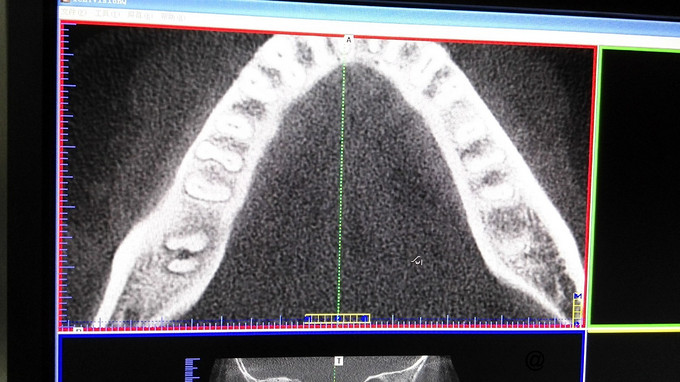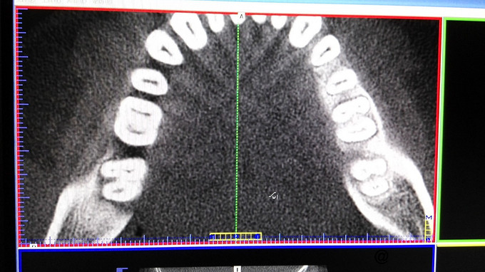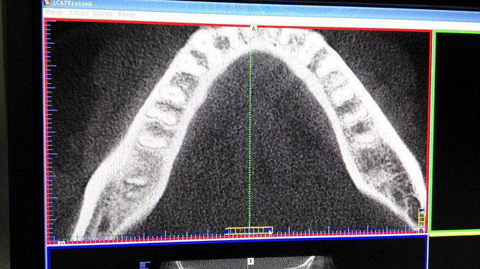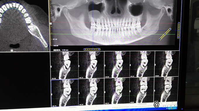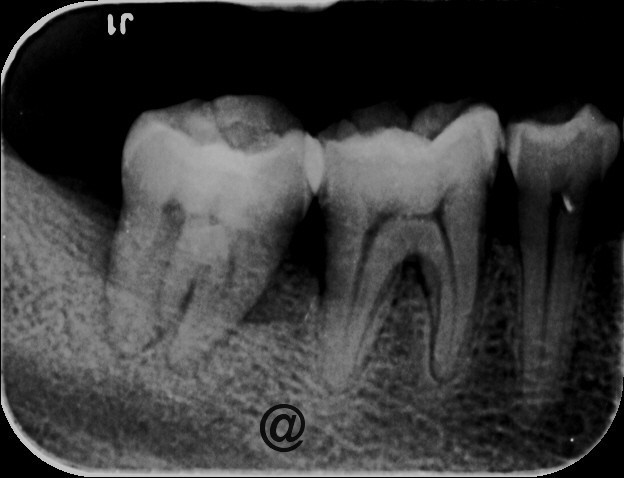 检查:右下7牙冠完整,近龈缘可见一突起脓包,少量脓血分泌物溢出,PD=10mm,余位点PD=3mm左右,叩痛(+),松动I度,电活力测试较正常牙迟钝。X线示:右下7牙槽骨水平吸收至根中,根分歧下低密度影像,远中根管增宽,可以根折。复拍CT:右下7根分歧下低密度影像,未达根尖,两根在舌侧融合,唇侧分开,唇侧无根柱,未见根折。