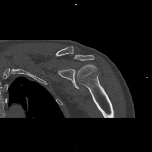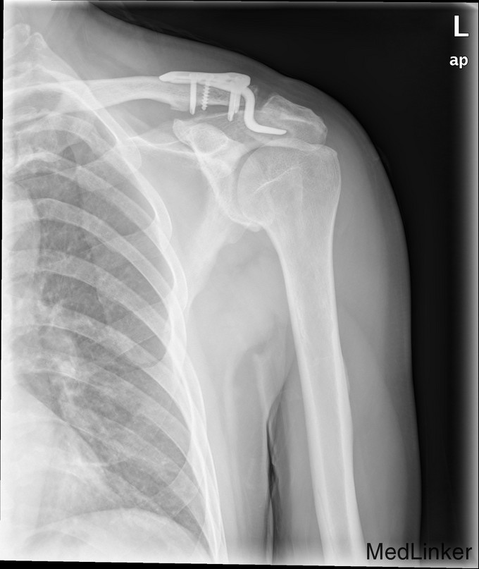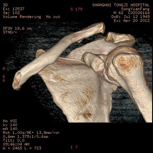 主诉:摔伤后左肩疼痛伴活动受限20天。 病史:患者入院前20天不慎摔伤,左肩不能活动,遂来我院急诊,摄片示左肩锁关节脱位,入院治疗。
