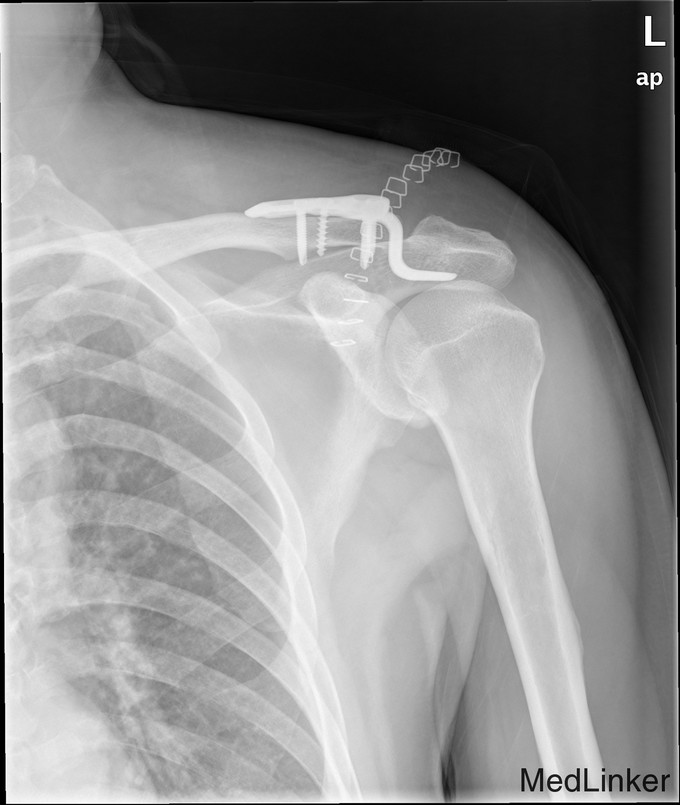 完善术前检查和准备后,行左肩锁关节脱位切开复位内固定术,术顺,术后安返病房,内固定使用锁骨钩。