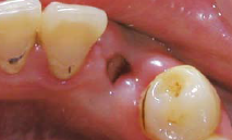 左下3缺失,牙龈略红肿,近远中距离可,对颌无伸长 X线示牙槽窝内空虚