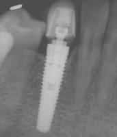 术区常规消毒铺巾,碧蓝麻阻滞加浸润麻醉,牙槽脊顶切开翻瓣,尖钻定位,逐级备洞,植入牙槽窝清创后预备植牙窝,植入种植体(Replace Select®,4.3 mm×13 mm),唇侧缺损处填充自体骨屑。拧上愈合基台,穿龈愈合,严密缝合,常嘱术后4个月后复诊取模,2周后戴牙