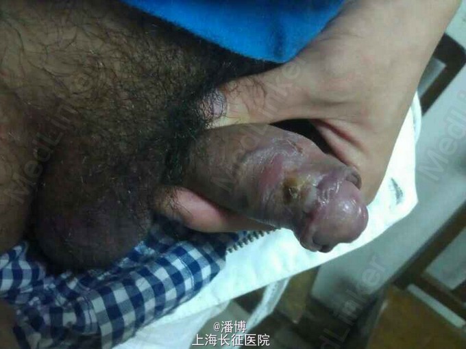查体: 鼻尖,上唇可见红斑基础上脓性结痂形成,左侧面部可见一溃疡面,上覆脓痂,呈蛎壳状。躯干,四肢未见类似皮损。阴茎可见糜烂,结痂,瘢痕形成伴萎缩。患者自诉该皮疹存在三月余。 患者三月前于外院行阴茎,肛周尖锐湿疣切除术。追问病史,自诉近年来有多次不洁性生活史。 建议隔天赴门诊行Std全套检查