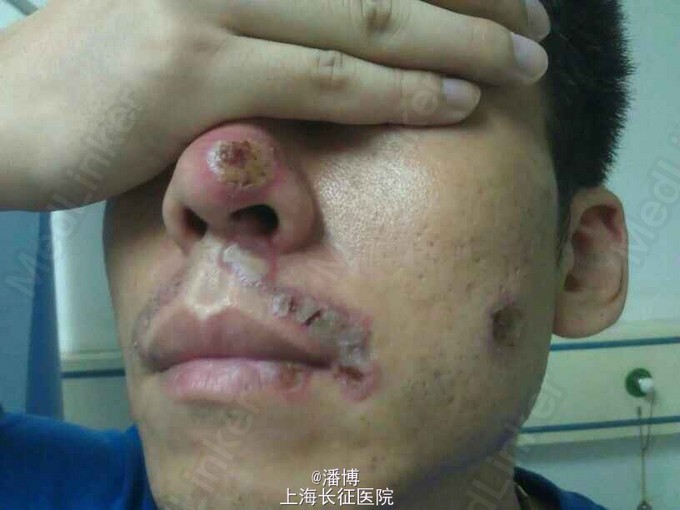 患者男,28岁,因“面部红斑糜烂一月”赴我院急诊就诊。患者一月前无明显诱因出现鼻背部红斑,其后皮疹累及上唇和鼻周皮肤。红斑基础上出现糜烂,痂皮。皮疹无瘙痒,无疼痛,无触痛。患者自诉近期有干咳。