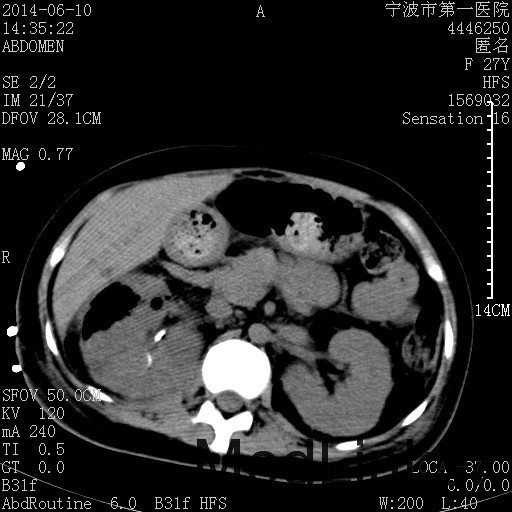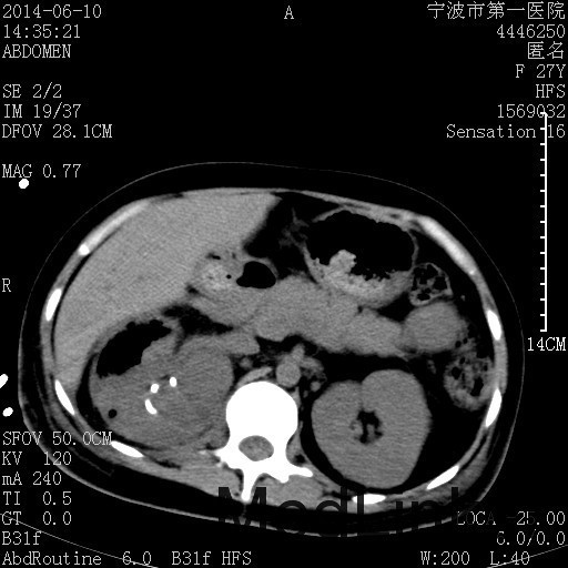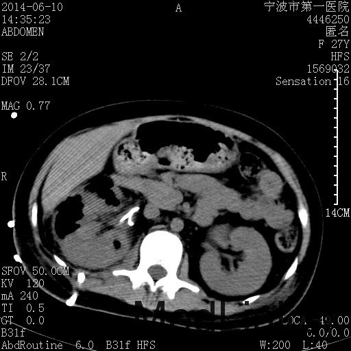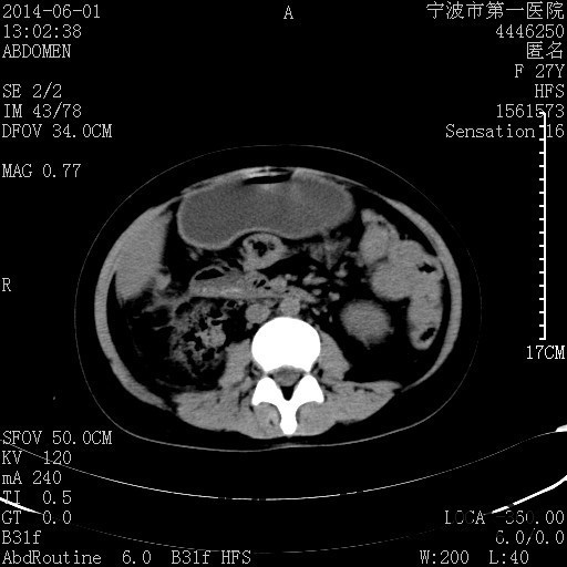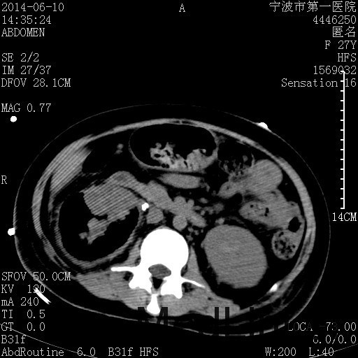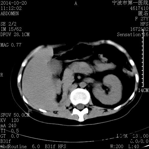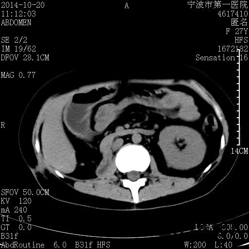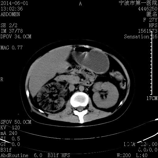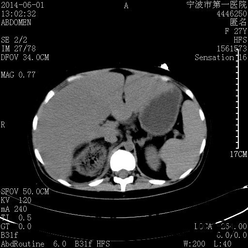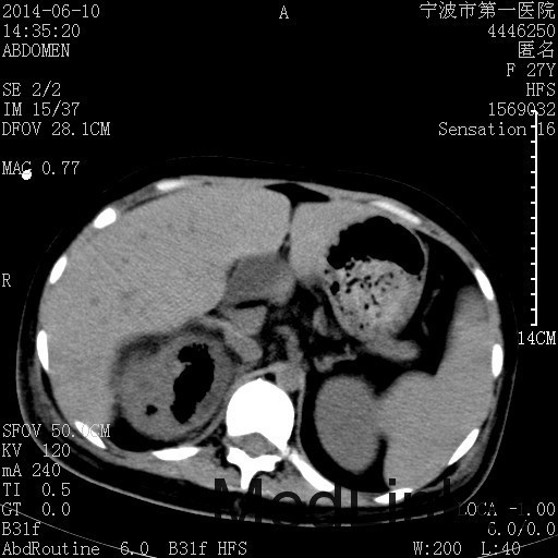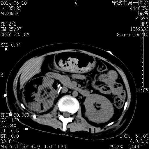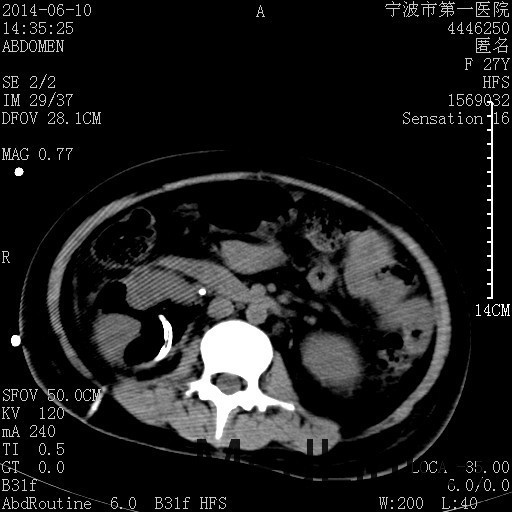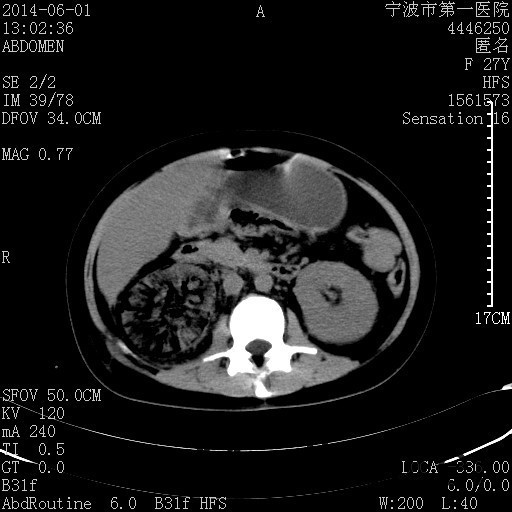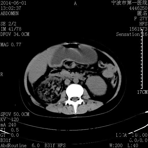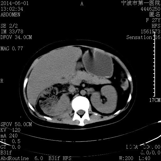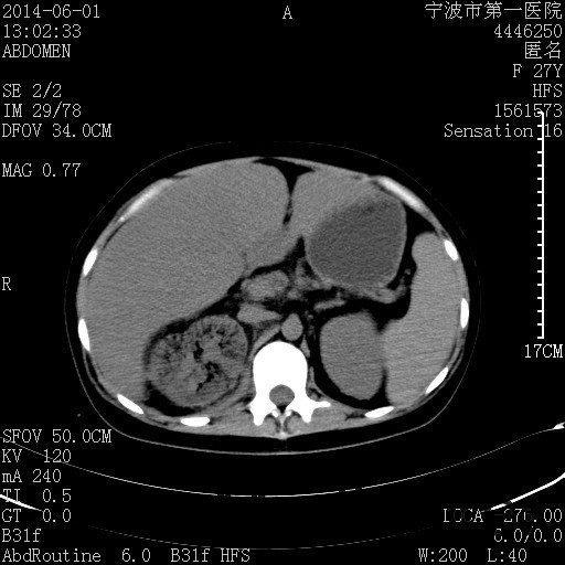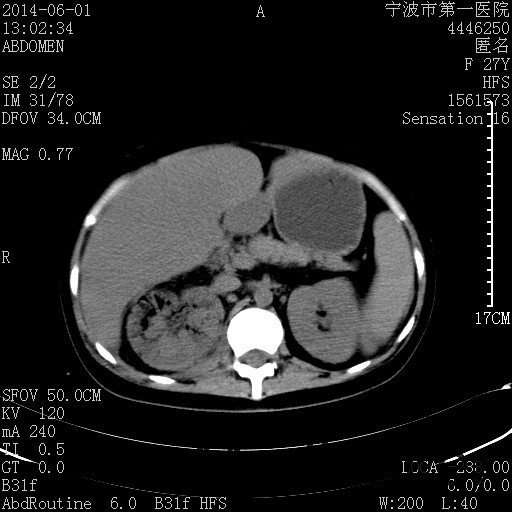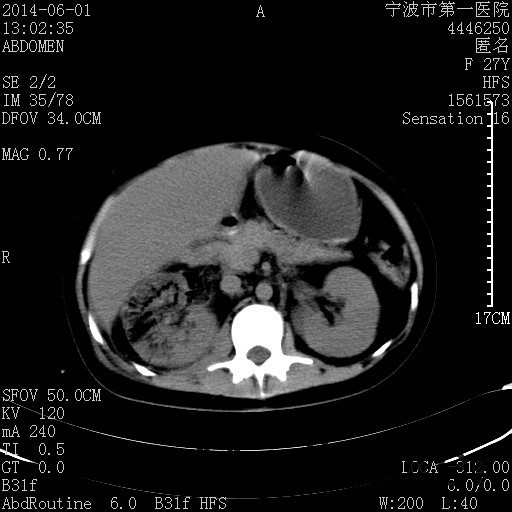 患者,女,27岁,因“右下腹疼痛伴呕吐2天”入院 患者无明显诱因出现右下腹疼痛伴呕吐、发热,体温最高39度,急诊CT示:右肾集气,考虑气性肾盂肾炎。