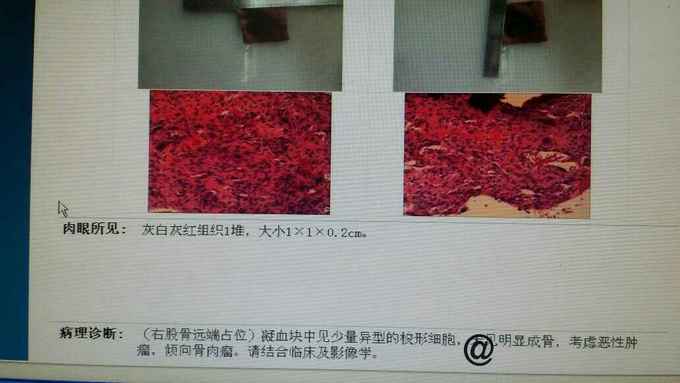 主诉:右大腿疼痛一月余 病史:患者一月前无明显诱因出现右大腿疼痛,未予诊治,自服消炎止痛药物治疗(具体不详),效差,至当地县医院DR示:右股骨远端占位,建议上级医院进一步诊治。