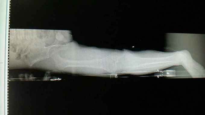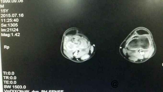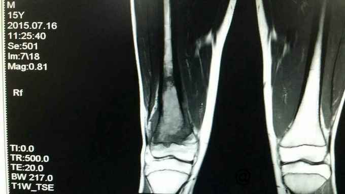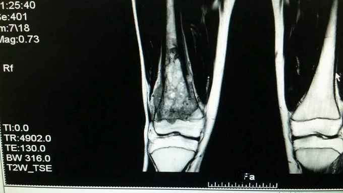 完善术前各项检查,检验,穿刺活检回示:考虑骨肉瘤,参加省病理会诊及北京积水潭会诊回示:符合骨肉瘤,进行术前新辅助化疗,期间定制肿瘤假体,化疗2个周期后,患者复查磁共振,肿块明显缩小,行右股骨远端骨肉瘤肿瘤膝关节置换术。