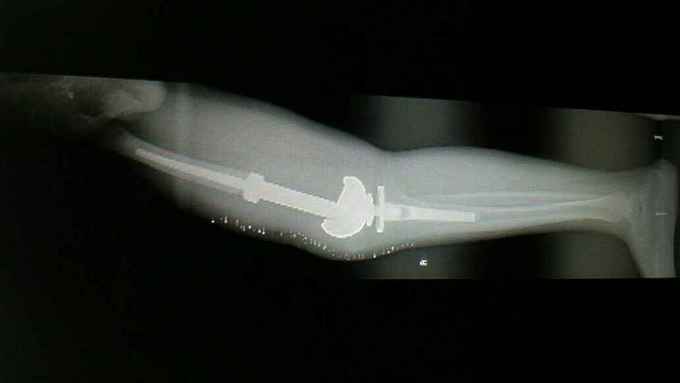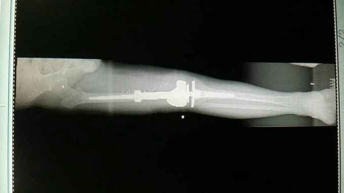 随访:患者术后化疗4个周期,现患肢功能锻炼良好。 讨论:肿瘤膝关节置换,要求首先明确病例诊断,术前新辅助化疗,术中广泛切除病变组织,包括穿刺点周围组织,术后辅助化疗。
