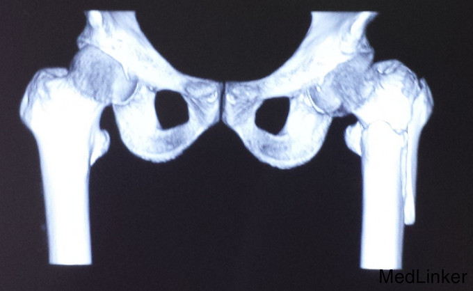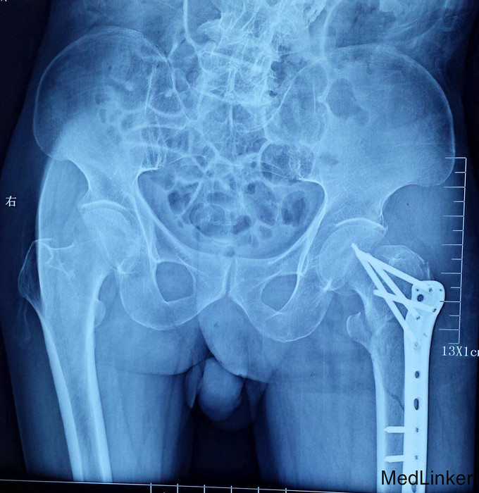 X光片提示,患者在摔倒时,右腿发生了粗隆间合并粗隆下骨折。各项指标均符合,先进行了两天的静脉消炎注射,第三天进行了手术,手术顺利。