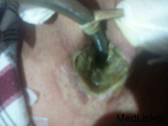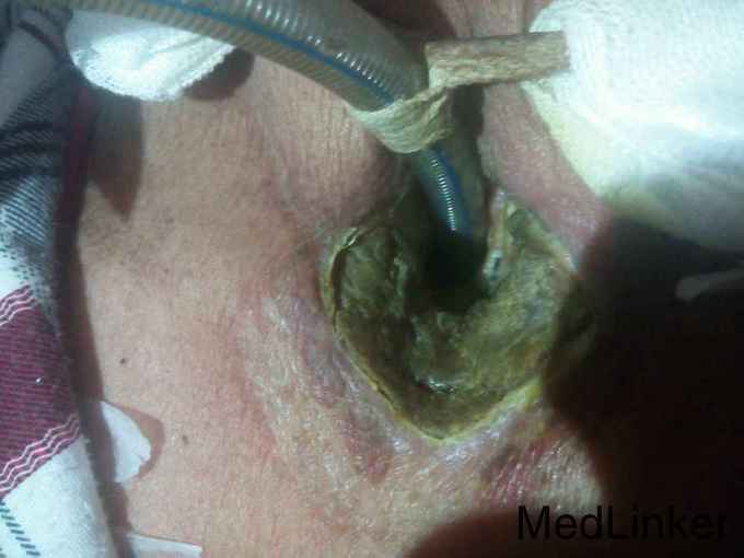 喉癌术后放射性造瘘口坏死。 目前经过局部皮肤切开排气,造瘘口改换为麻醉气管插管,局部换药处理。