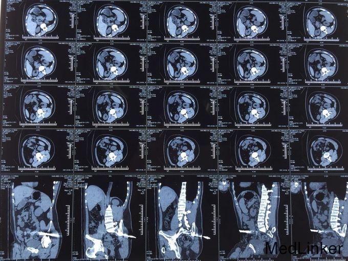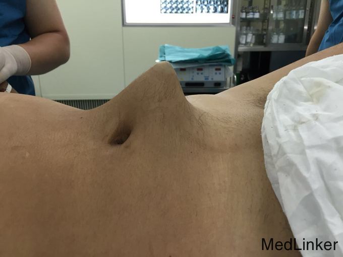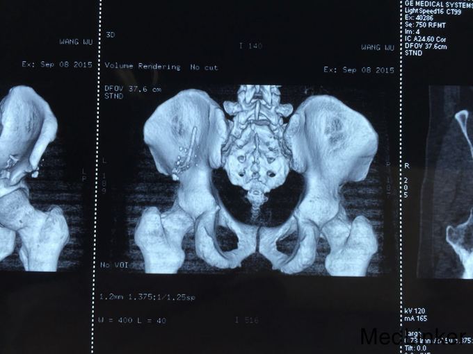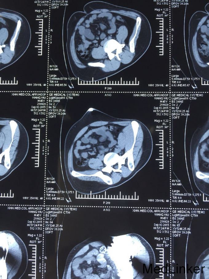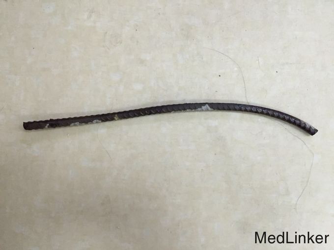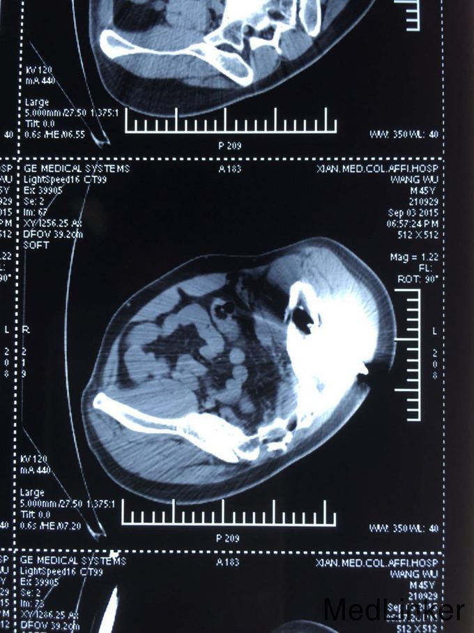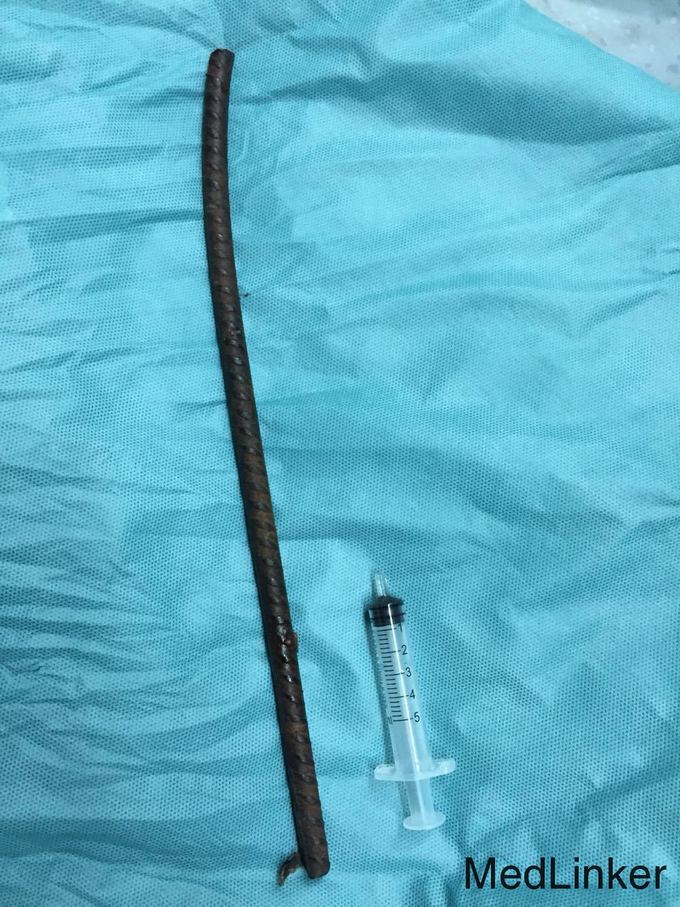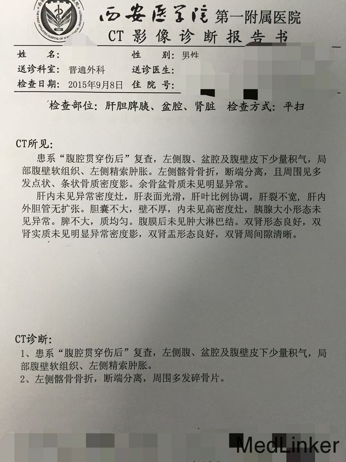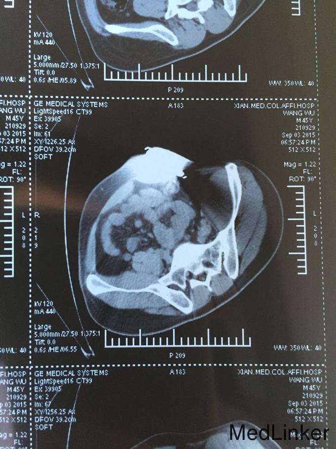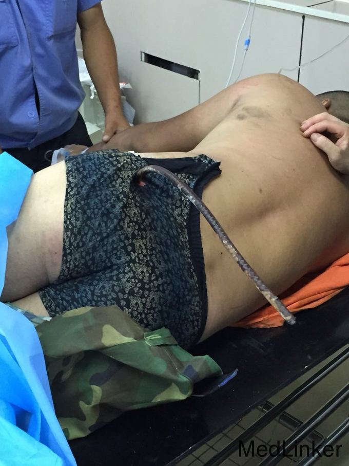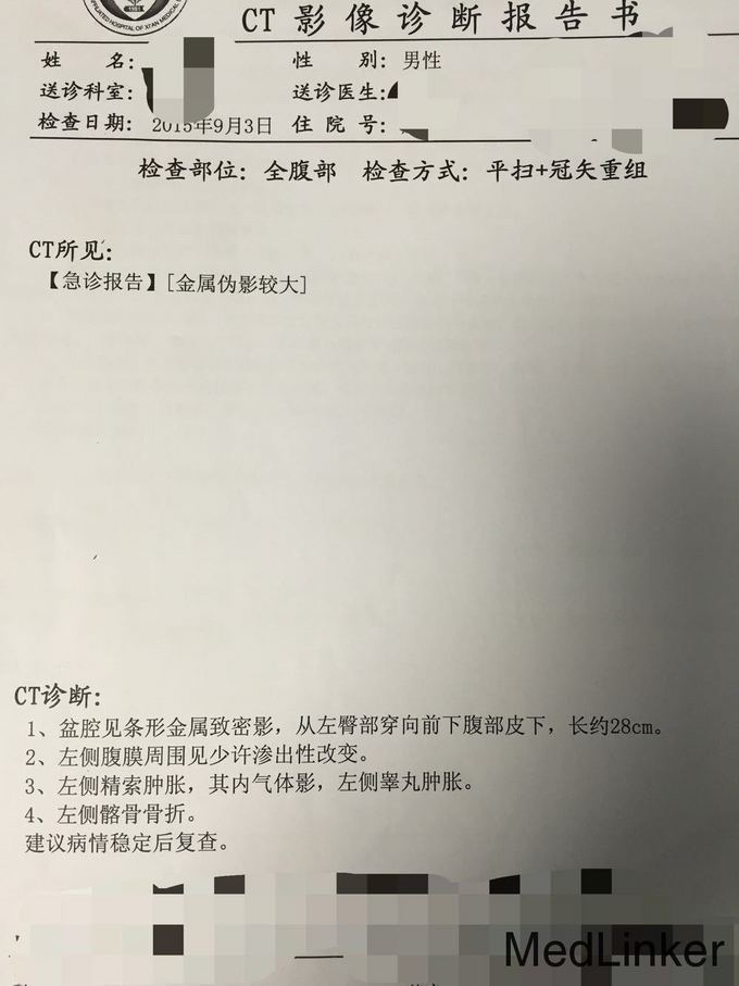 查体:T:36.6℃,P:80次/分,R:19次/分,Bp:130/85mmHg。心肺未见明显异常,腹平坦,无腹壁静脉曲张,腹部柔软,无压痛、反跳痛,腹部无包块,左侧腰髂部近左臀部可见钢筋样异物刺入直达左下腹腹壁皮下,未穿透腹壁皮肤,左臀部皮肤裂伤伴出血,伤口处压痛,肝脾肋下未触及,左下腹压痛,Murphy氏征阴性,移动性浊音阴性,肝脾肾区无叩击痛,肠鸣音未见异常。 辅助检查:全腹部CT检查示:1.盆腔见条状金属致密物,从左臀穿向前下腹部皮下,长约28cm;2.左侧腹膜周围见少许渗出性改变;3.左侧精索肿胀,其内气体影,左侧睾丸肿胀;4.左侧髂骨骨折。