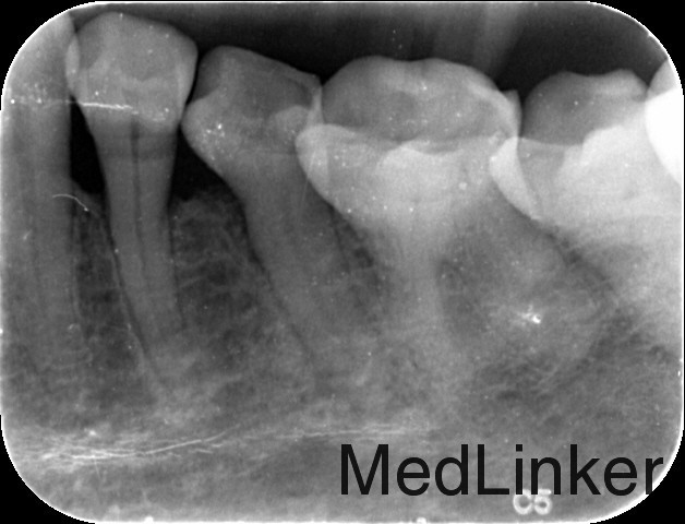 主诉:左下后牙咬硬物后松动不适3日 既往史:骨质疏松10余年,否认药敏史,否认重大手术史及输血史,否认家族性遗传病史。 现病史:患者4月前因左下后牙区牙龈反复肿胀不适于我科就诊,诊断为左下第二前磨牙慢性根尖周炎,行根管治疗术后树脂修复冠部牙体缺损。3日前不慎咬硬物后,自觉左下后牙松动不适,来我科就诊。