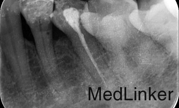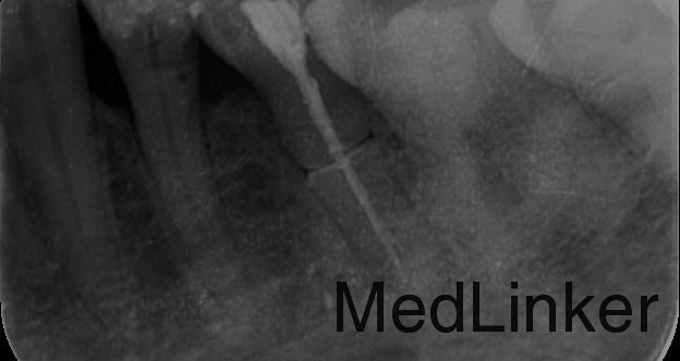 检查: 35合面见牙色充填物,探边缘密合,叩痛(+),松动I度,牙龈轻度红肿。 X线示:35根管内见致密根充影像,牙根根上、中1/3交界处连续性中断。