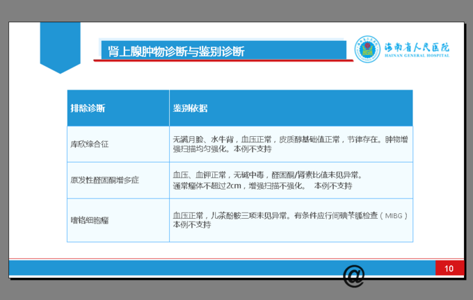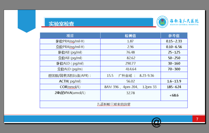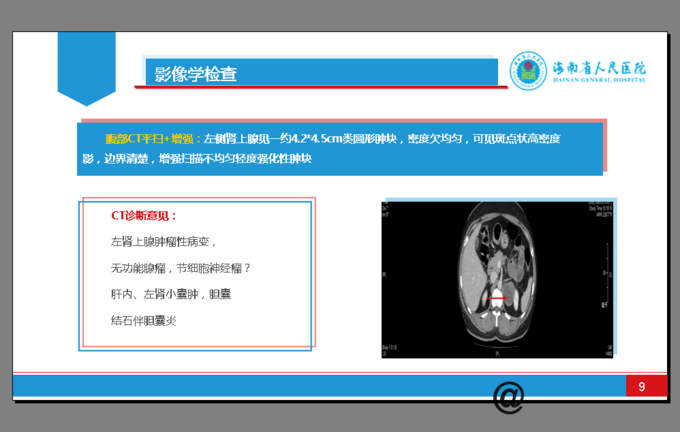 查体:T 36.7 ℃ ,P 92次/分, R 20次/分 BP 103/73mmHg 营养中等,无满月脸、水牛背,无肢端肥大,浅表淋巴结未触及肿大。肺部查体(-)。心率92次/分,律齐,各瓣膜区未闻及杂音。腹软,无压痛、未扪及包块,肝脾肋下未触及。双下肢无浮肿 生化:K 4.32 mmol/L、Na 139.1 mmol/L、Ca 2.16 mmol/L、ALT 86.7 U/L、AST 60.4 U/L、 CHOL 6.07 mmol/L、LDL-CH 4.52 mmol/L 血气分析:pH 7.45、pCO2 33.50 mmHg、pO2 70.60 mmHg 肿瘤十二项、三大常规、凝血四项、输血四项未见异常。 泌尿系+肾上腺彩超:左侧肾上腺见一低回声团,大小约51*37mm,边界尚清,内回声欠均匀,其内未见血流信号。双肾、输尿管、膀胱未见异常声像 肝、胆、脾、胰腺彩超:胆囊结石。彩色多普勒门静脉及脾静脉血流信号未见异常 胸片:心肺未见异常征象