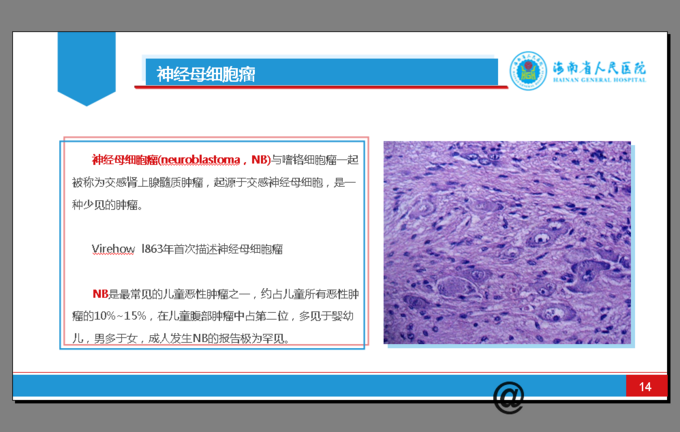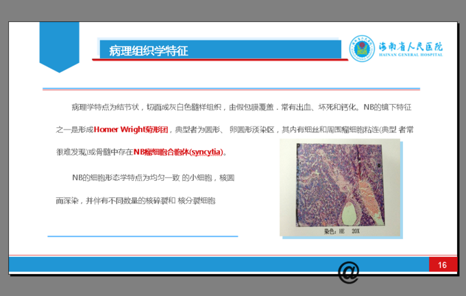 神经母细胞瘤(NB)多为单侧,不论同时发生还是相继发生,双侧发生者极其罕见, 临床表现无特异性,常以发现腹部包块、发热或腹痛为主诉,可伴如消瘦、纳差、乏力、面色苍白等全身症状,一些症状则多因肿瘤转移压迫引起,呼吸急促、全身骨关节痛、下肢痛以及发现转移肿块等。 少数患者有儿茶酚胺增多的症状,如发作性或持续性高血压,心悸、多汗等。 本例患者亦无明显自觉症状,常规体检发现肿物就诊,可见病变之隐匿性。因此,NB患者术前易被误诊断为嗜铬细胞瘤、无功能腺瘤或腺癌。 寻找转移灶必须作骨髓检查找NB细胞,对可疑骨骼侵犯部位作X线检查或”Tc“扫描,进行胸部X线或CT和全腹B超或CT检查,必要时做静脉肾孟造影等 诊断主要依靠病理结果,但各种影像学检查对疾病的诊断同样重要:X线平片检查可见腹膜后肿物影,30%的患者有肿瘤局部钙化表现。 显著的标志就是儿茶酚胺代谢产物的测定VMA及HVA,儿童95%,成人40%-57%,对肿瘤反应和复发具有指导意义 NB常见起源于肾上腺髓质,或起源于其它部位的交感神经节,如腹部、盆腔、纵膈内、胸椎旁等处,转移为血行转移,常见的转移部位为骨、骨髓、肺、胸膜、脑、乳腺、肝等器官 预后:恶性程度高,成人预后较儿童差,常在1年内复发、转移,5年生存率30%,最终生存率不足5%