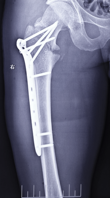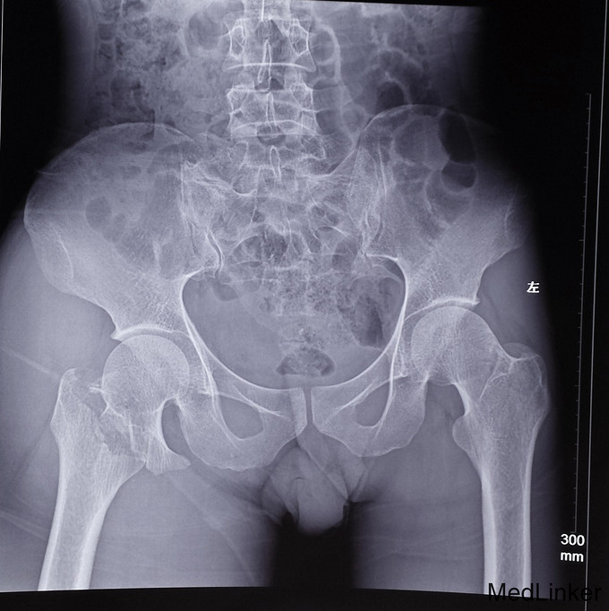 光片提示:该患者发生发生股骨颈基底部移位骨折。急诊:静脉滴注消炎。两天后对患者进行了复位内固定手术。