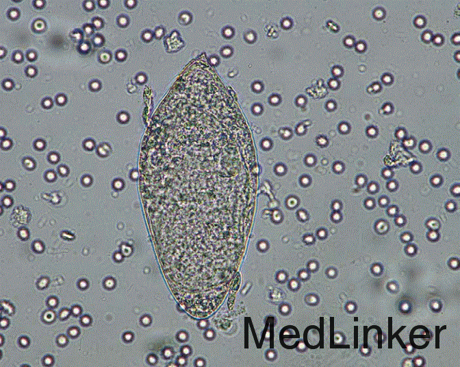 尿检镜下红细胞超过 250/mm3(正常为 0-5 个)。尿沉渣发现有卵圆形虫卵(约长 110-170μm,宽 50-70μm),具端刺和透明卵壳,是典型的埃及血吸虫。还找到了通常生活在自然环境水(湖、河)毛蚴和幼虫。