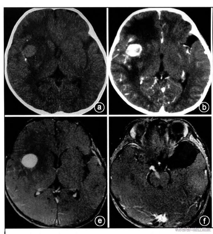 辅查:眼底检查示双侧乳头水肿,颅脑CT示右额叶等密度占位,伴钙化。增强后明显强化,约2厘米。增强MRI T1加权呈等信号,T2 加权等或稍低信号。脑桥、右顶叶也可见病灶,病灶周围可见水肿。