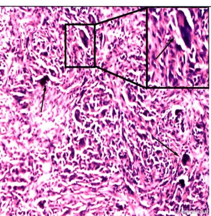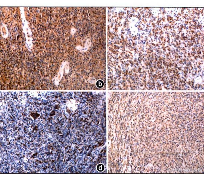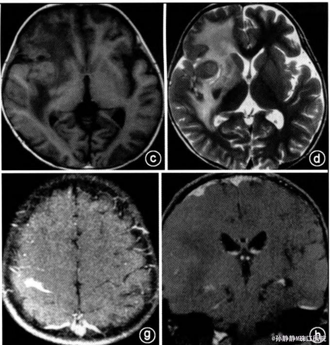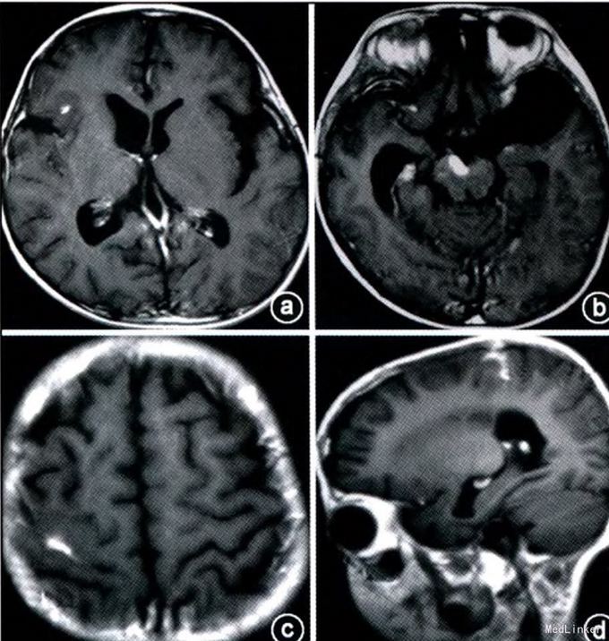 初步诊断:颅内感染性肉芽肿:淋巴瘤?结核?白血病脑病? 处理:考虑患儿有明显颅内压增高症状,行右侧扩大翼点入路开颅手术,切除右额叶明显病变。病理示明显新生血管形成和炎性细胞浸润,部分见组织细胞,核为肾形,疑为朗格汉斯细胞。免疫组化CD68及波形蛋白阳性。S-100及Cd 1a部分细胞阳性。 确诊:颅内朗格汉斯增生症。