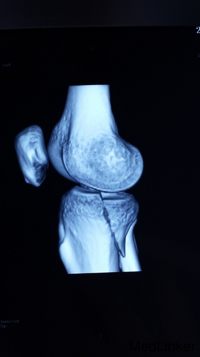 CT三维重建、MRI:膝骨节内侧半月板、外侧半月板前角损伤,前交叉韧带损伤。