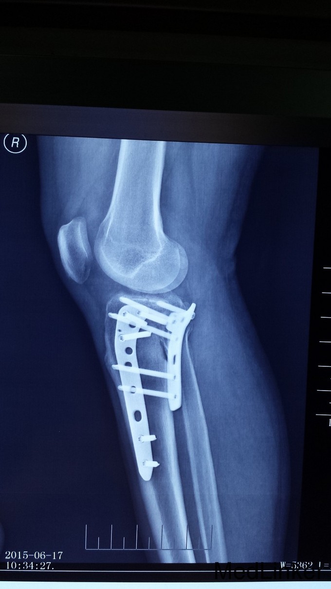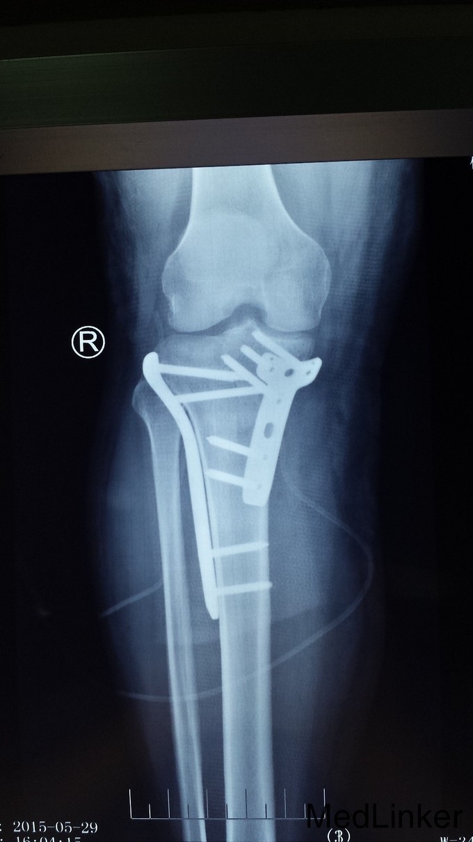 光片提示:患者发生累及后内踝的平台骨折。急诊:施行后内、前外侧联合入路手术治疗。先作后内侧入路复位后内髁骨折块及内髁骨折,再作前外侧联合入路复位外髁骨折,同时处理半月板及前、后交叉韧带损伤。