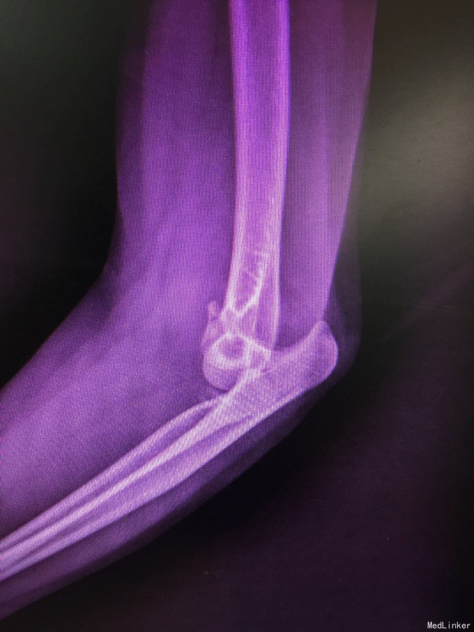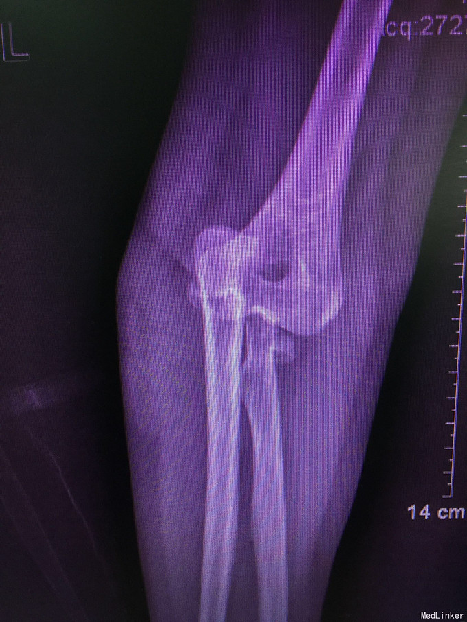 患者缘于2周前做家务时自离地50cm处跌落,左上臂先着地支撑,即感左肘关节疼痛,无法自主活动,左肘周围肿胀,无感觉障碍,遂至我院就诊。